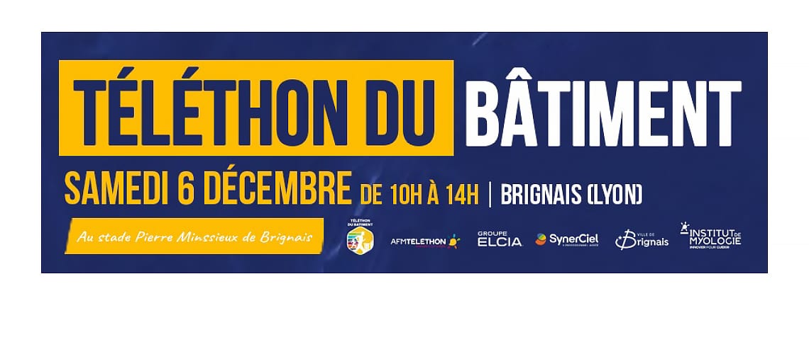 Après le succès de la 1ère édition, le Téléthon du Bâtiment arrive en région. En partenariat avec Synerciel et la Ville de Brignais, le leader de l’édition logicielle spécialisée Menuiserie, Store, Fermeture donne rendez-vous aux entreprises du bâtiment de la région lyonnaise le samedi 6 décembre à Brignais (20 minutes de Lyon). Avec un objectif : collecter le maximum de dons pour l’AFM Téléthon et son Institut de Myologie !