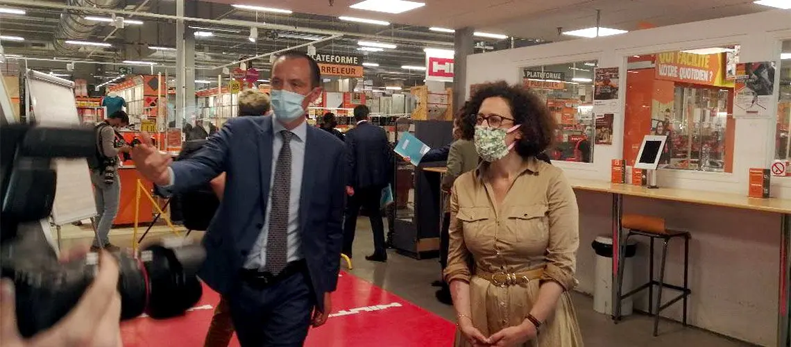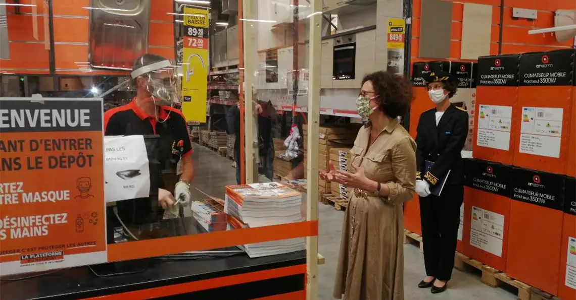Ce mardi 26 mai 2020, Emmanuelle Wargon, secrétaire d'État auprès de la ministre de la Transition écologique et solidaire, était en visite à la Plateforme du bâtiment (groupe Saint-Gobain) d'Aubervilliers (93) pour "remercier les acteurs du bâtiment qui ont continué à se mobiliser durant la crise sanitaire". Verre & Protections Mag a assisté à cette visite. A ses côtés, Guillaume Texier, directeur général adjoint de Saint-Gobain France, et Jean-Louis Bolard, directeur général de la Plateforme du bâtiment, étaient chargés de lui faire la visite de l'entreprise et de lui expliquer les mesures prises depuis deux mois pour faire face à l'épidémie de Covid-19. Des mesures qui ont, semble-t-il, plu à la ministre, puisqu'elle celle-ci a remercié et félicité l'ensemble des acteurs du bâtiment pour avoir continué à livrer sans interruption les chantiers, le bâtiment étant pour Emmanuelle Wargon « aussi important que l'hôpital ou l'agro-alimentaire » pour l'économie et la santé du pays.