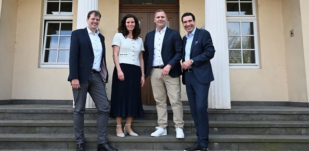 De gauche à droite : Bernd Hillbrands (directeur général, division Windows & Doors, Forterro), Miriam Berzen et Lars Klaes (directeurs généraux de Klaes) et Marcus Pannier (président de Forterro), réunis à l’issue de la signature.