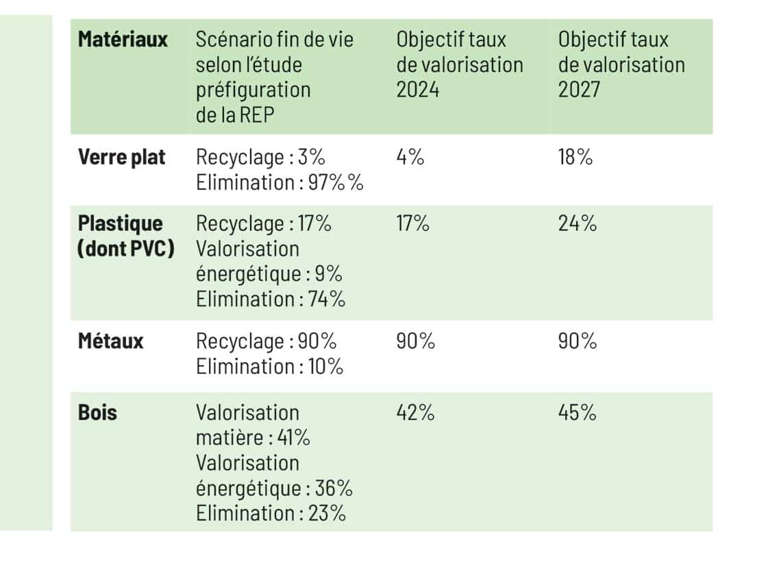 La REP a des objectifs de taux de valorisation des déchets de déconstruction ambitieux qui varient selon les matériaux, et les menuiseries sont particulièrement concernées :