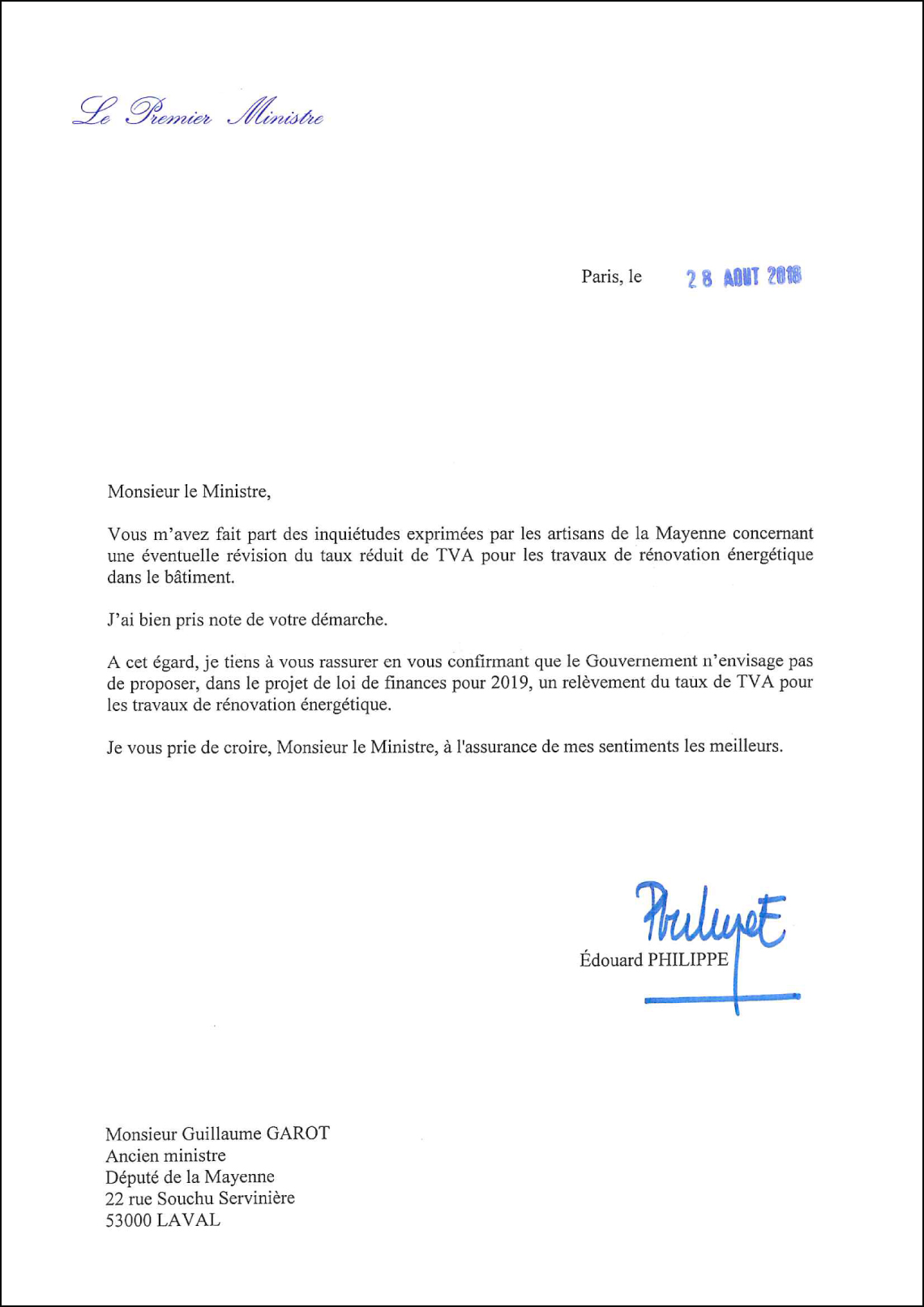 C’est une excellente nouvelle que vient de recevoir le député de la Mayenne (53), Guillaume Garot (PS). En effet, le député de la circonscription de Laval, avait, en tant que vice-président de la commission du développement durable et de l'aménagement du territoire à l’Assemblée Nationale, interpellé Edouard Philippe sur l’inquiétude des professionnels du bâtiment de la Mayenne (artisans) sur les menaces pouvant peser sur le maintien ou non de la TVA à taux réduit sur les travaux de rénovation énergétiques. Dans un réponse (voir notre photo du courrier de Matignon), le Premier Ministre confirme donc officiellement ce, qu’auparavant, un autre membre du gouvernement (Bruno Le Maire) avait seulement évoqué oralement : « le gouvernement n’envisage pas de proposer, dans le projet de loi de finances pour 2019, un relèvement du taux de TVA pour les travaux de rénovation énergétique ».