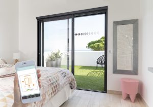 En associant cette solution à la box domotique Somfy, l’utilisateur garde toujours un oeil sur ses baies, même à distance et peut les refermer si besoin via son smartphone. De plus, la baie coulissante automatisée et connectée s’intègre parfaitement dans l’écosystème io‐homecontrol et s’interface avec tous les équipements de la maison connectée (volets roulants, chauffage, alarme,…). Ainsi, l’utilisateur ne choisit plus entre renouvellement de l’air intérieur et économies d’énergie : à l’ouverture de la baie coulissante, le chauffage se coupe automatiquement.