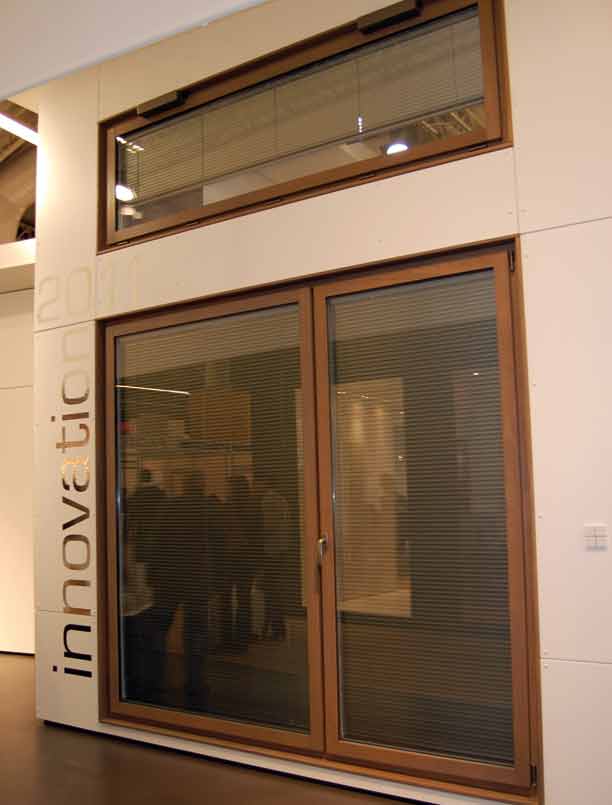 La fenêtre M3D est présentée dans sa version mixte respirante (Mix-R) dans un ensemble comprenant une porte-fenêtre à un vantail ouvrant et un fixe, avec un châssis ouvrant à soufflet en imposte. L’ensemble est motorisé avec des stores intégrés dans la lame d’air. La finition intérieure est en chêne éco-certifié, et à l’extérieur, c’est l’aluminium qui est privilégié.