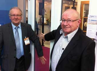 A gauche, Pierre Riou, Pdg de Riou Glass, aux côtés de Pierre Glorieux, IQ Glass, l'inventeur du vitrage chauffant
