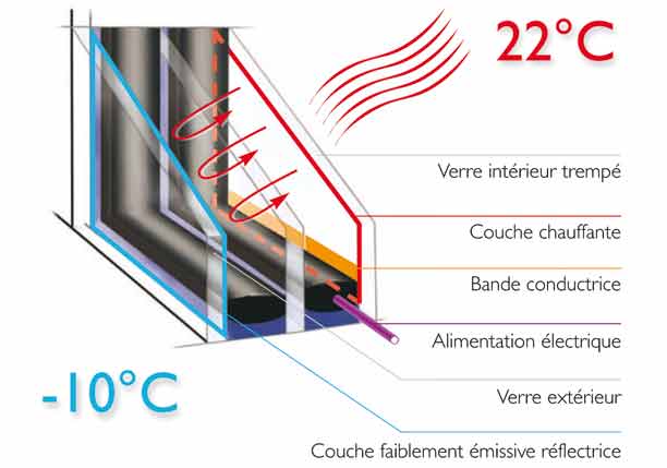Le nouveau Rglass Calor, lancé par le groupe Riou Glass et présenté pour la première fois sur son stand au salon Artibat de Rennes, est un vitrage isolant qui fait office de système de chauffage électrique par rayonnement, totalement intégré et invisible. Le principe est simple : une couche composée de microparticules métalliques est déposée sur toute la surface interne du verre intérieur. Reliée à une alimentation électrique par un connecteur, cette couche fait office de résistance chauffante à basse température (20 à 45°C), qui rayonne vers l’intérieur de la pièce. La face chauffante est en verre clair trempé de 4 ou 6 mm et la contre-face peut être en verre recuit, trempé ou feuilleté, retardateur d’effraction.