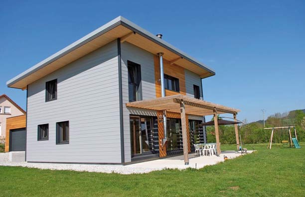 Les travaux ont été réalisés par une coopérative artisanale locale, la CCB (voir encadré). La maison est à ossature bois, avec une pergola fixe en façade sud qui a été demandée par le client. La porte d’entrée est située à l’ouest, sous la toiture débordante du garage.